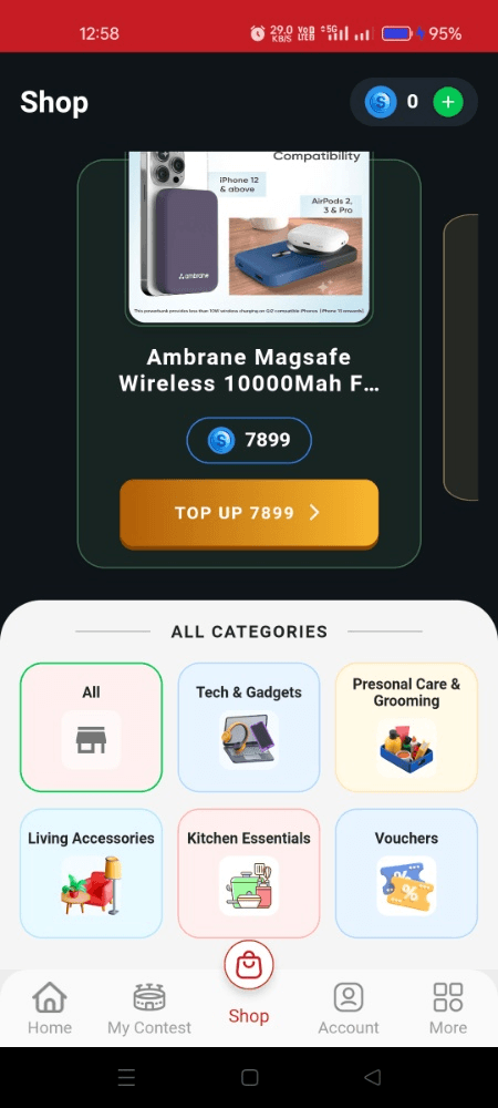 • Example: In the Shop section, you can find premium items like the Ambrane MagSafe Wireless 10000mAh Power Bank for around 7899 tokens.